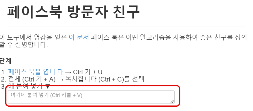 페이스북 방문자 확인 사이트에 접속을 한 뒤 3번 항목의 박스 안에 붙여넣기를 해 줍니다. 붙여 넣기를 하면 약간의 시간이 흐른 뒤 내 페이스북에 방문한 사람들의 목록을 보여줍니다.