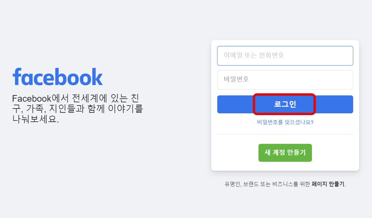 내 페이스북에 누가 방문했는지 확인하기 위해서는 컴퓨터에서 페이스북에 로그인을 해야 합니다. 로그인을 한 뒤 내 페이스북 화면으로 이동을 합니다.