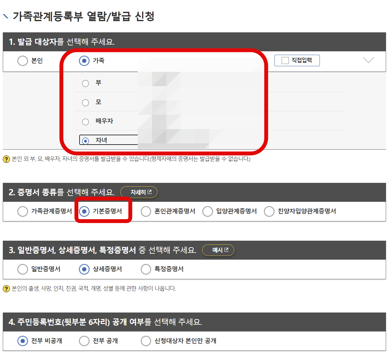 기본증명서를 자녀가 발급받기 위해서는 공인인증서 혹은 부모님 신분증을 가지고 관할 주민센터에 방문해야 합니다. 하지만 인터넷에서 발급을 받게 되면 부모의 공인인증서만 있다면 자녀 기준으로 기본증명서를 발급받을 수 있습니다.